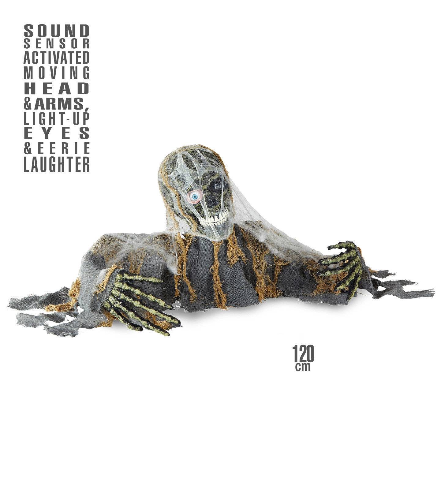 Decorul animatronic schelet zombie 120 cm include un senzor ce se activeaza la zgomot, provocand miscarea capului si a mainilor, alaturi de un led in zona ochiului stang care se aprinde intermitent. Este inclus de asemenea si un sunet infricosator, completand astfel perfect decorul.