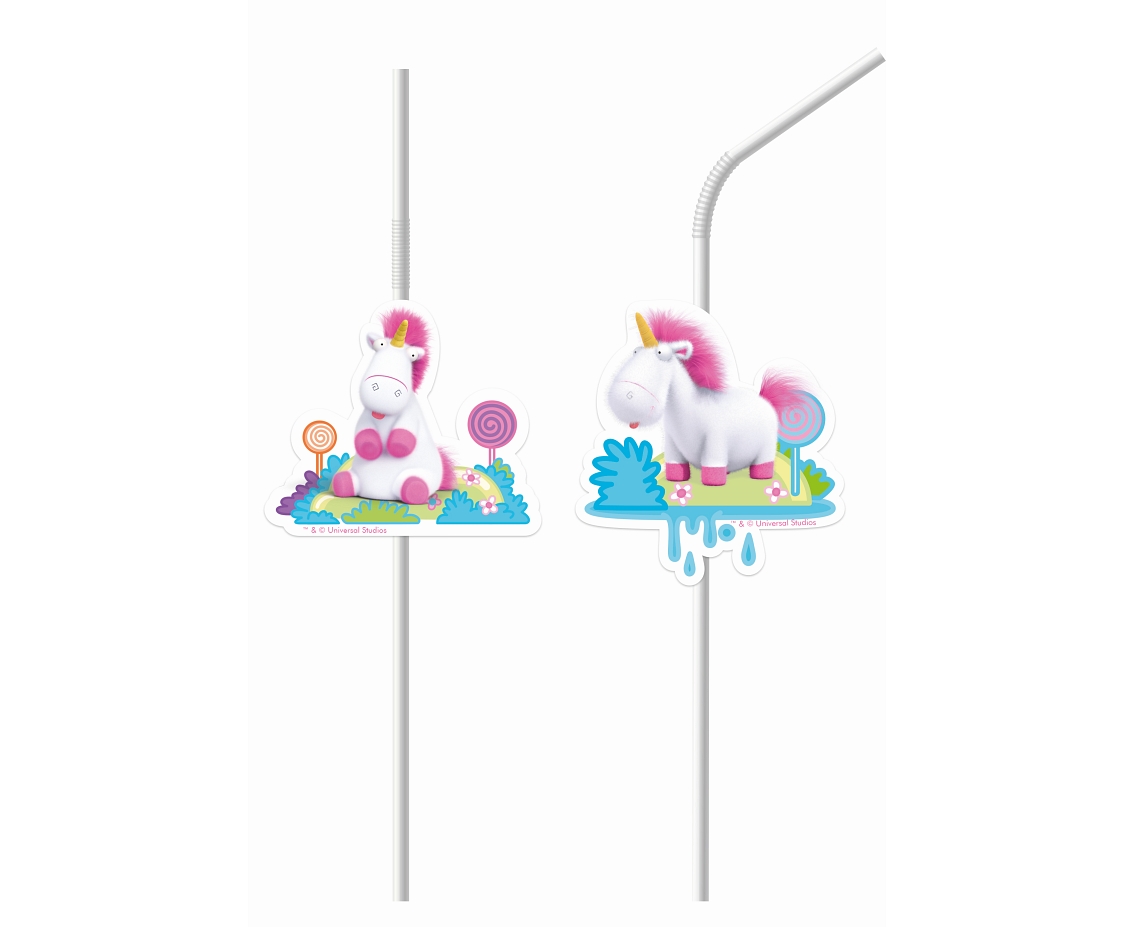 Set 6 paie de baut party transparente pentru a vedea culoarea bauturilor, decorate cu medalioane unicorn Fluffy sunt perfecte pentru petreceri tematice.
